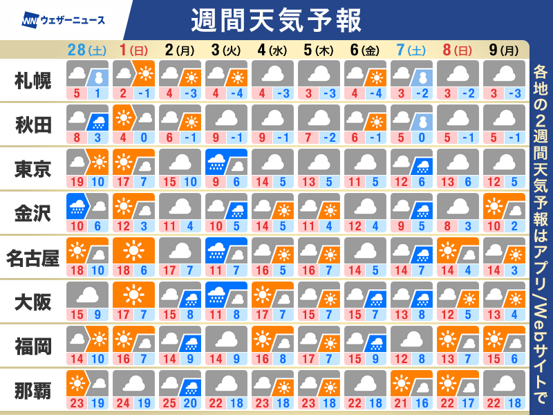 3月1日(日)は高気圧に覆われて穏やかな天気になるものの、2日(月)からは前線を伴った低気圧が東シナ海から接近し、天気が下り坂に向かいます。九州など早いところでは2日(月)から雨が降りだし、3日(火)〜4日(水)は再び広範囲で雨の降る可能性があります。この低気圧に寒気が引き込まれるため、一時的に気温がグッと下がる見込みです。