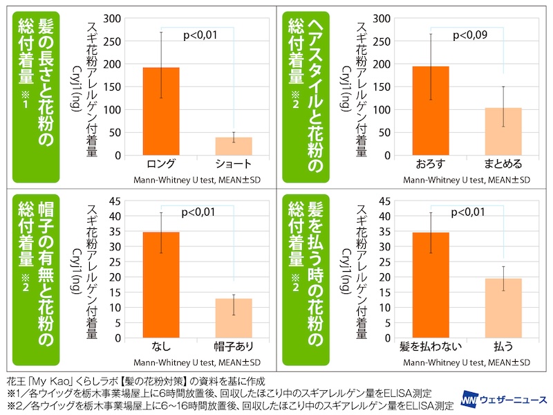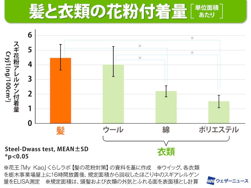「花粉の付着量は、一般的にはロングヘアの方がショートヘアよりも総付着量は増えます。また髪の表面には頭皮から分泌された皮脂が付着していて、この皮脂も花粉が付着しやすく、花粉のつきやすさに影響しているようです。