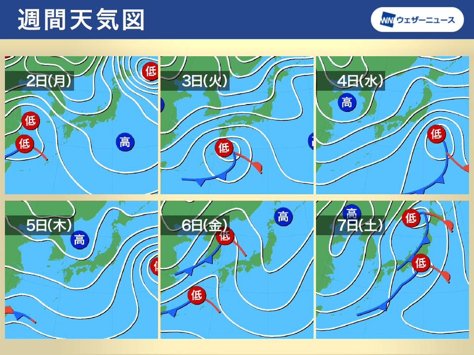 4日(水)〜5日(木)は一旦雨の降る所が少なくなるものの、週後半は再び天気が下り坂です。前線や低気圧の接近により6日(金)は西日本で雨が降りだし、7日(土)は東日本や北日本に雨の範囲が広がります。