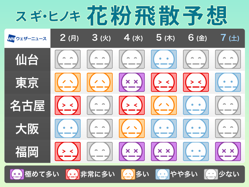本州ではスギ花粉のシーズンを迎えています。特に雨上がりの晴天時や気温が上がる日は花粉が大量に飛散するおそれがあります。洗濯物は部屋干しにする、外出時のメガネやマスクの着用、帰宅時には衣服についた花粉をしっかり払うなど、万全の対策を心がけてください。
