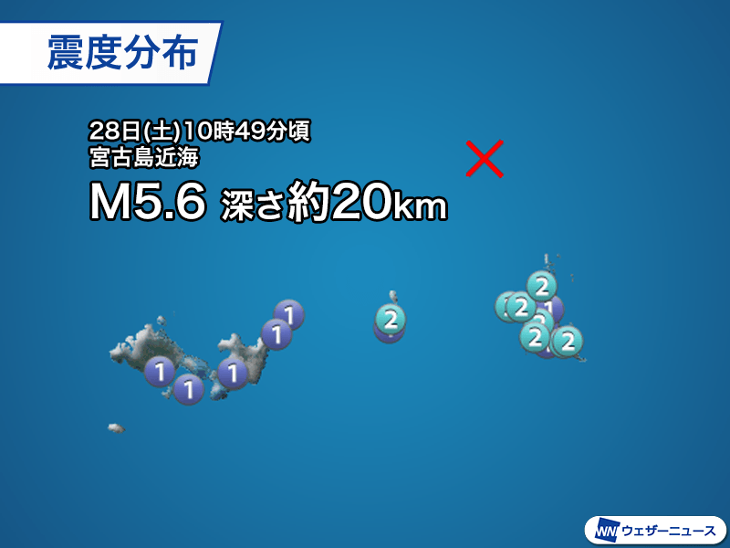 2月28日(土)10時49分頃、宮古島近海を震源とするマグニチュード5.6、深さ約20kmと推定される地震が発生しました。この地震で沖縄県宮古島市と多良間村で最大震度2、石垣市、竹富町で震度1の揺れを観測しています。