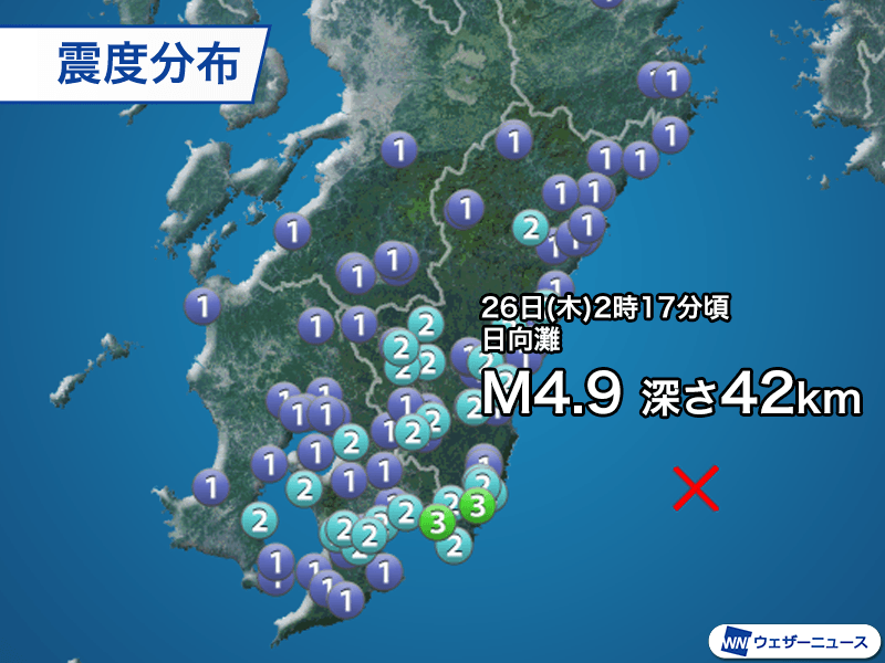 26日(木)2時17分頃、日向灘を震源とするマグニチュード4.9、深さ42kmと推定される地震が発生しました。この地震で宮崎県日南市と串間市で最大震度3を観測しています。