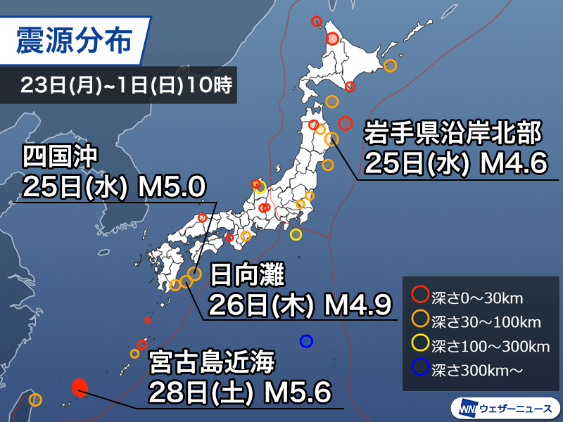 また、その前日の25日(水)18時07分には四国沖を震源とするマグニチュード5.0の地震がありました。2つの地震はともに南海トラフ巨大地震の震源域に近い地震ですが、正断層型と解析され、プレート境界型ではないとみられます。