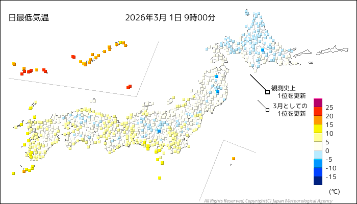 今日3月1日(日)の朝は、各地でやや冷え込み、西日本や東日本では都市部でも5℃くらいまで下がったところがあります。最低気温は、福岡7.1℃、高松3.6℃、広島4.9℃、大阪7.2℃、名古屋6.2℃、東京8.3℃、宇都宮3.2℃となっています。