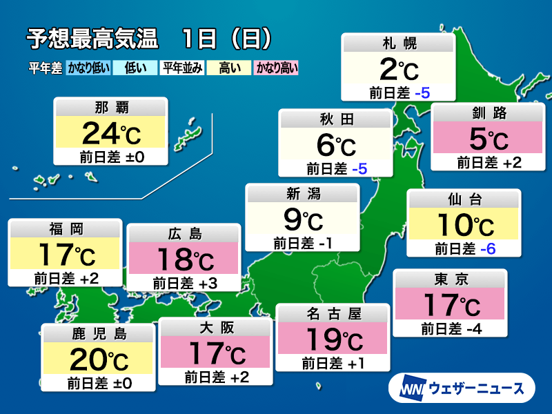 東北北部や北海道は5℃以下のところが多く、日曜日の外出は暖かい服装でお出かけください。