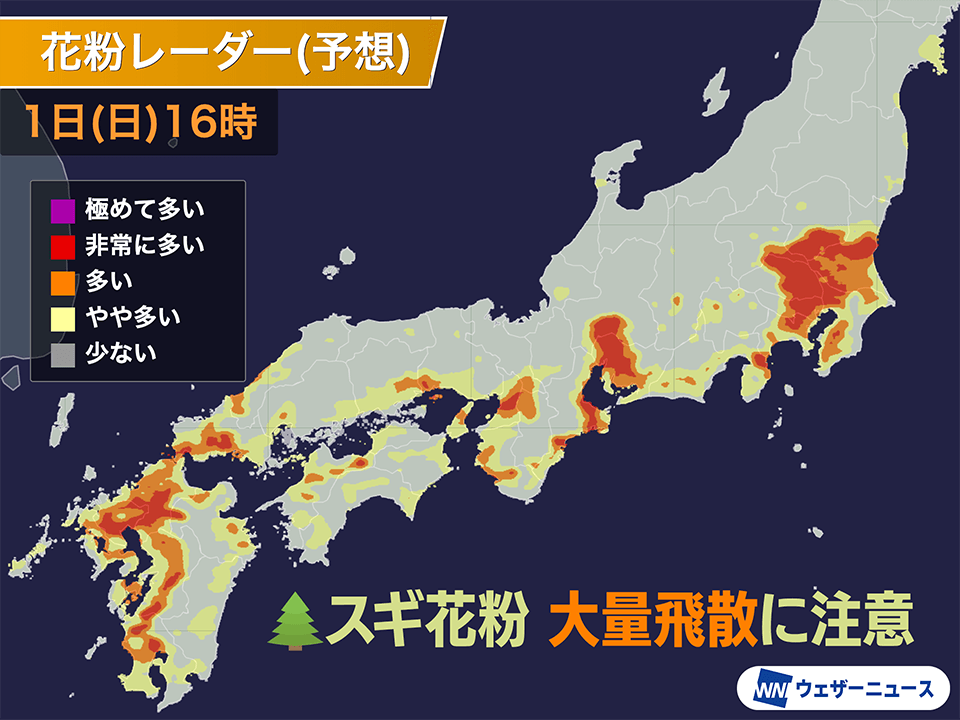 昨日に続いて花粉が大量に飛散するおそれがあり注意が必要です。