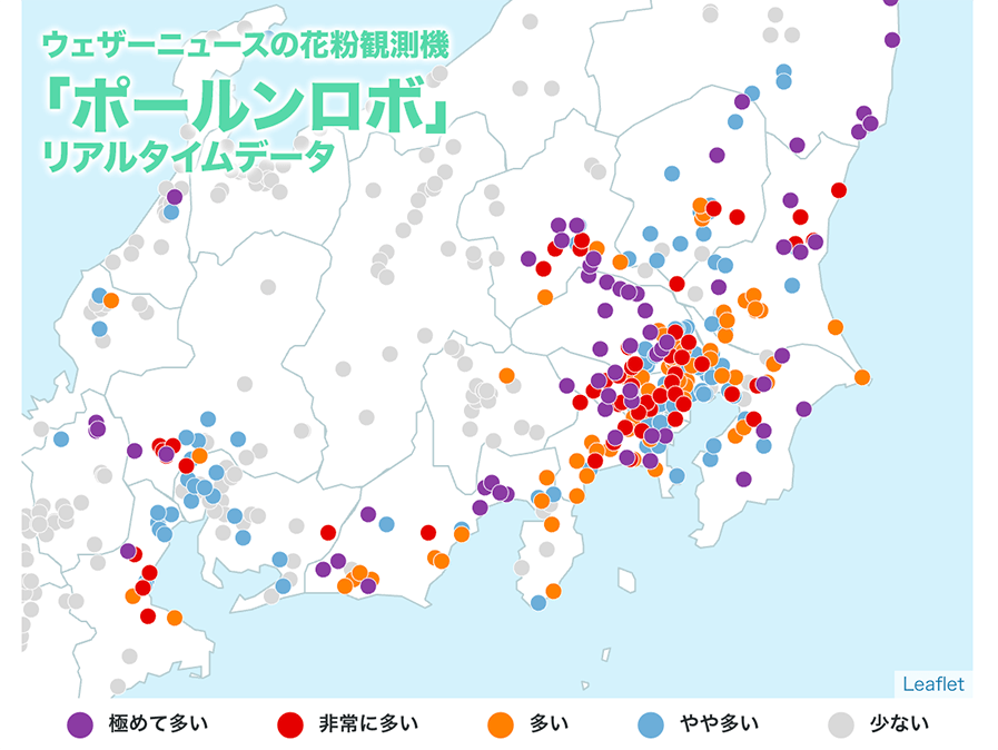 今日は風が弱まり、昨日のような広範囲での花粉大量飛散にはなっていません。それでも気温の上昇により、花粉が飛散しやすい気象条件になっています。