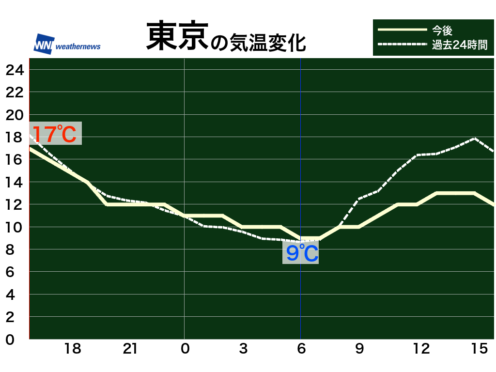 明日の朝はヒンヤリとした体感です。昼間は今日と同じくらいまで気温が上がる見込みです。
