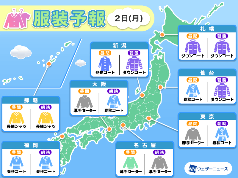 今日と明日の気温変化を比較して、気温に適した服装をご提案します。ウェザーニュースの服装予報もご活用ください。