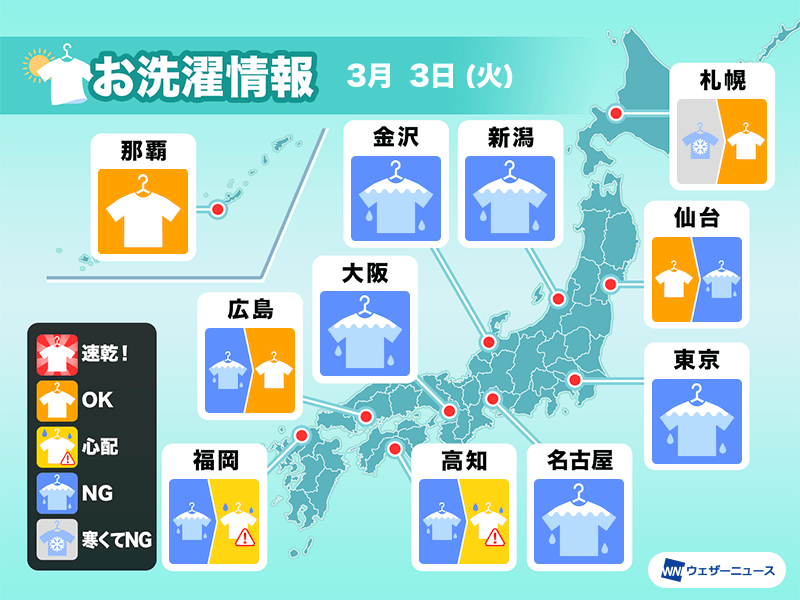 近畿から東日本の各地は朝から雨の一日です。特に、関東甲信では湿った雪が降る可能性もあります。日中の気温は5℃前後で、右肩下がりの気温変化となりますので、室内干しの際も厚手のものは乾きにくそうです。乾燥機を活用するのが良さそうです。