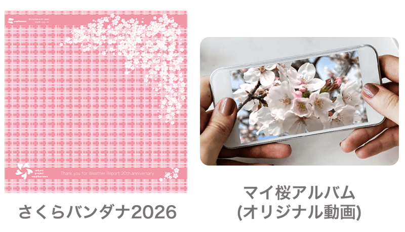 15日以上のマイ桜リポートを送ると「さくらバンダナ2026」、つぼみ・開花・満開・葉桜の4ランクを網羅したマイ桜リポートを計8枚以上送るとオリジナル動画「マイ桜アルバム」のプレゼントがあります。