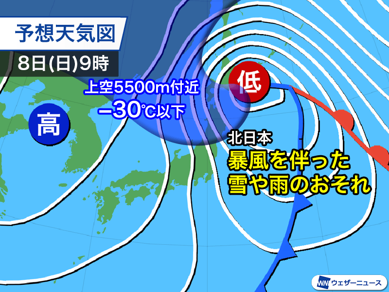 7日(土)から8日(日)朝に東北北部から北海道を通過する予想で、雨や雪、風の強まる所が多くなる予想です。暴風を伴った雨や雪となるおそれがあるため警戒をしてください。