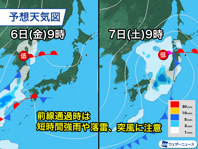 6日(金)〜7日(土)は前線通過で広範囲で雨 8日(日)は北日本で荒天のおそれ