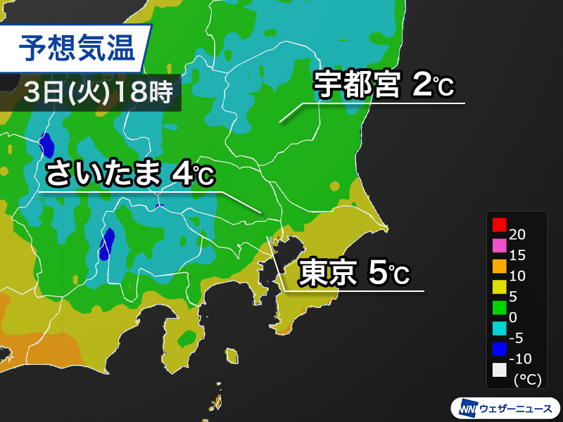 内陸部はさらに気温が低く、帰宅時間帯となる18時の気温分布をみると、5℃未満を示す緑色の領域が大きく広がっています。宇都宮市は2℃、さいたま市は4℃の見込みです。