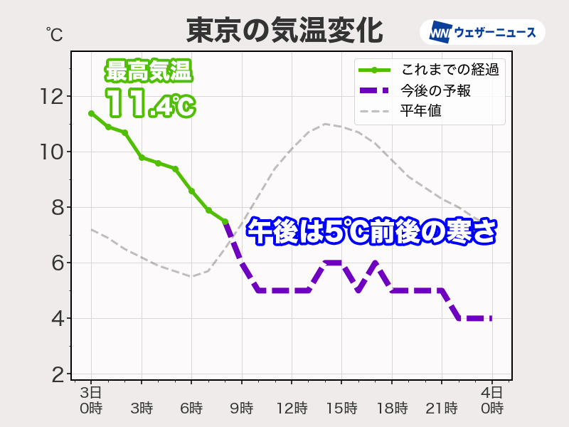東京都心は日付が変わった直後の0時26分に11.4℃を観測した後、ジリジリと気温が低下し、9時の時点では7.6℃となっています。この後も気温はさらに下がって、昼前には5℃前後となる予想です。午後は5℃前後で推移するとみられます。昨日2日(月)の昼間に比べると8℃前後も低く、真冬並みの寒さです。