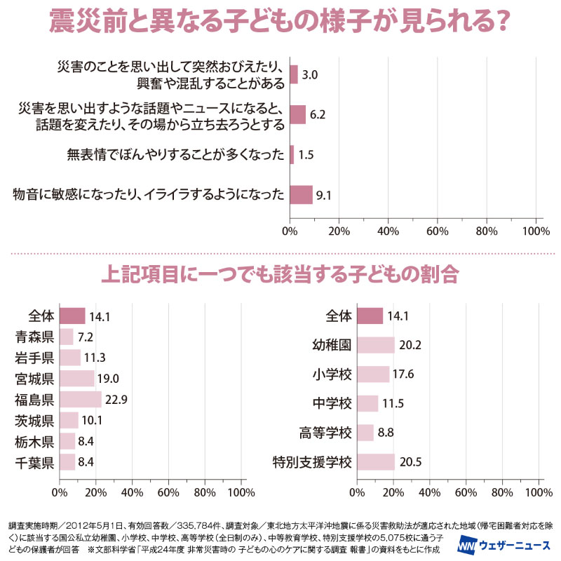 また、被災した子どもたちに心身不良症状が顕著に現れました。「非常災害時の子どもの心のケアに関する調査報告書」(2013年、文部科学省)によると、PTSD(心的外傷後ストレス障害)が疑われる症状が一つでもみられた子どもは、特別支援学校20.5%、幼稚園20.2%、小学校17.6%、中学校11.5%、高等学校8.8%と、年齢が低くなるほど増加傾向にありました。