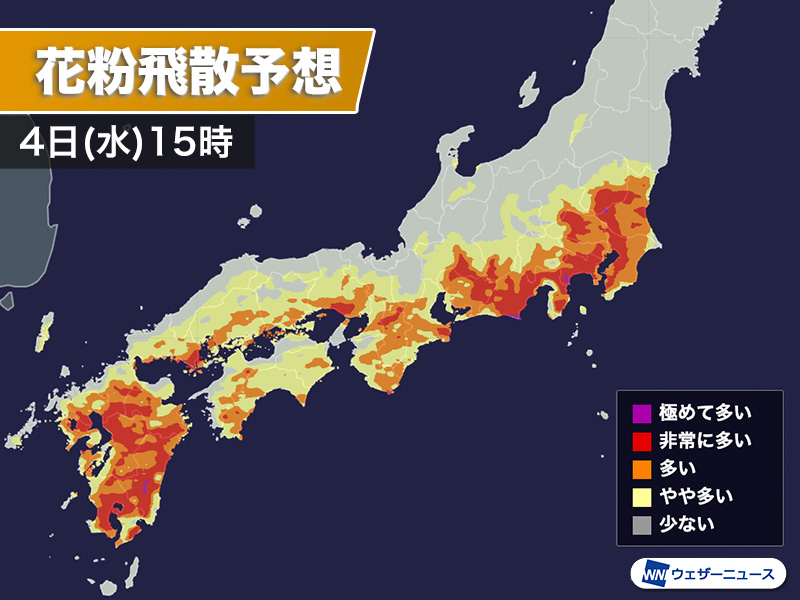 注意が必要なのは「花粉」です。関東や東海では、雨上がりの晴天に強風が加わることで、花粉が「非常に多い」から「極めて多い」ランクの大量飛散となるおそれがあります。外出時はマスクやメガネなどで万全の対策を行ってください。