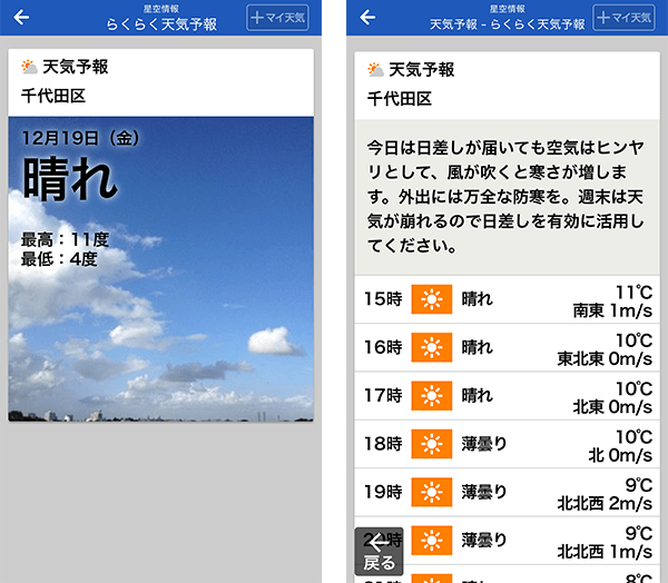 大きく見やすい「らくらく天気」は「ウェザーニュース」アプリで
