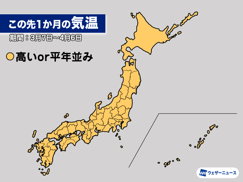 1か月の平均気温は全国的に平年並みか平年よりも高い予想となっています。