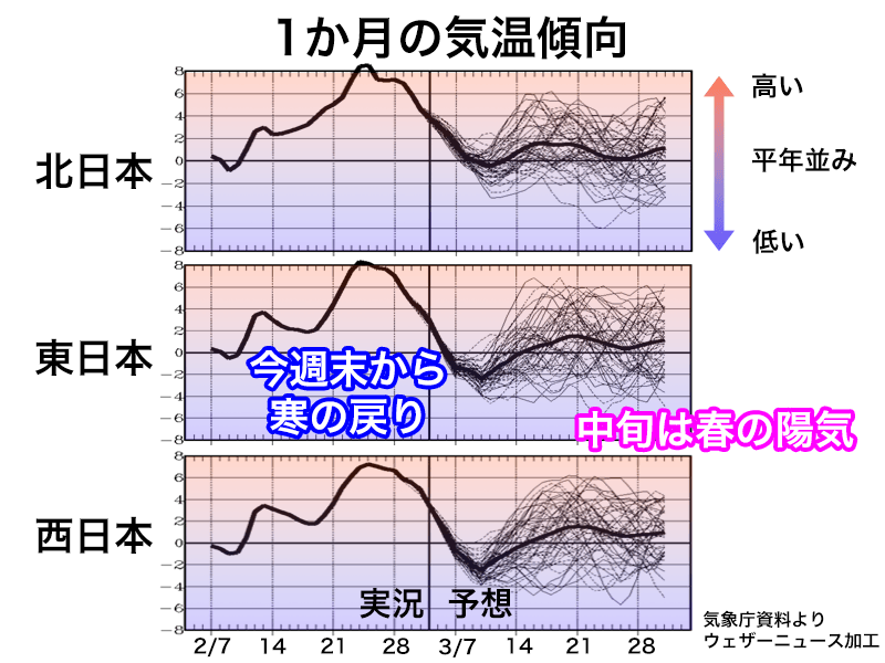 上空1500m付近の気温の傾向を見ると、2月中旬から下旬に見られたような極端な高温はなく、寒の戻りも今週末から来週にかけて一時的なものとなる見込みです。