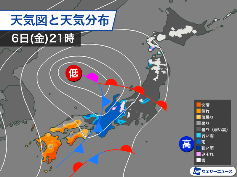 今日6日(金)は低気圧や前線の影響で西から雨が降り出します。局地的に雨が強まったり、雷や突風を伴う可能性があるため注意が必要です。
