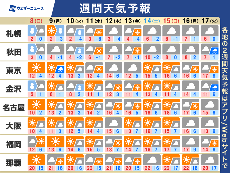 来週中頃にかけては寒気の影響で気温が低めとなり、平年並か平年より低めの気温となる日が多い予想です。