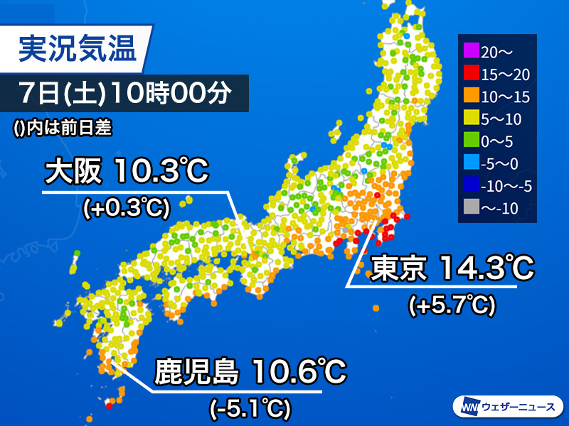今日7日(土)10時の気温は、鹿児島10.6℃、福岡8.6℃、広島8.6℃、大阪10.3℃、名古屋10.6℃となっています。