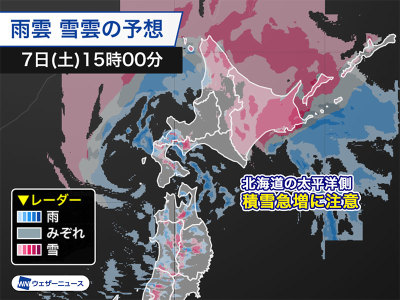 特に北海道の太平洋側で雪雲が発達し、内陸部を中心に積雪が急増する予想です。
