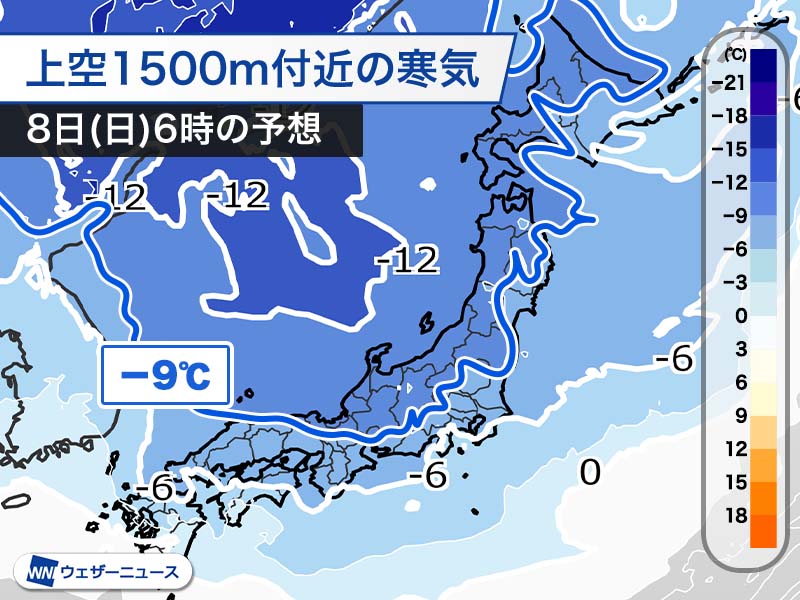 上空1500m付近で−9℃以下の寒気が北陸付近まで南下する予想で、北日本だけでなく北陸の平野部でも雪になる所が多い見込みです。