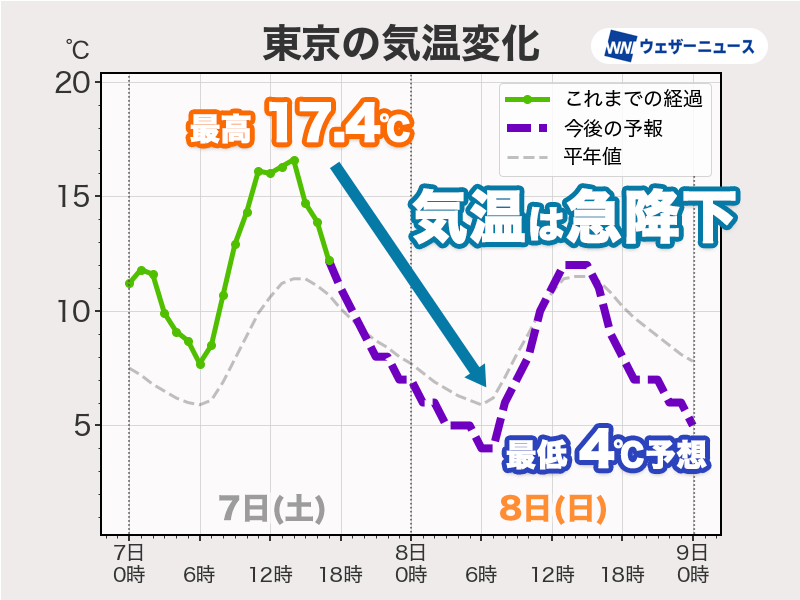 今日7日(土)の関東は気温が高くなりました。最高気温は東京都心で17.4℃、横浜で18.1℃となっています。