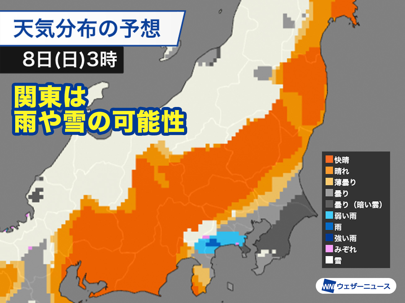 関東は8日(日)朝にかけて雨や雪の可能性 7日(土)夜は気温が急降下