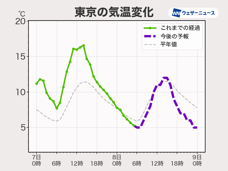 昼間は日差しが届きますが、昨日7日(土)ほど気温は上がりません。暖かな服装でお出かけください。