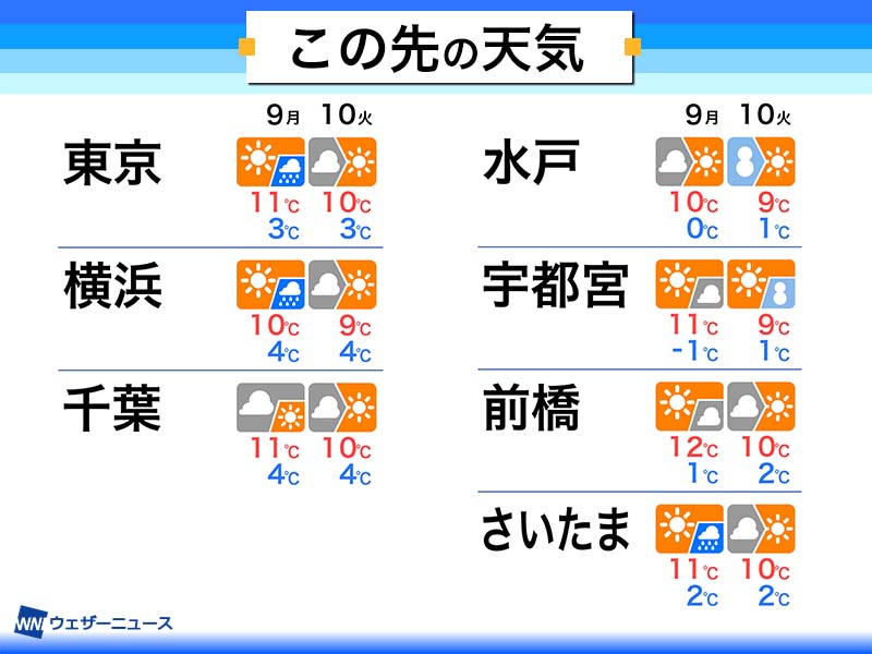 特に宇都宮や水戸など関東北部は雪に変わりやすい予想です。10日(火)の朝は関東各地で冷え込むため、通勤通学時は暖かな服装が良さそうです。