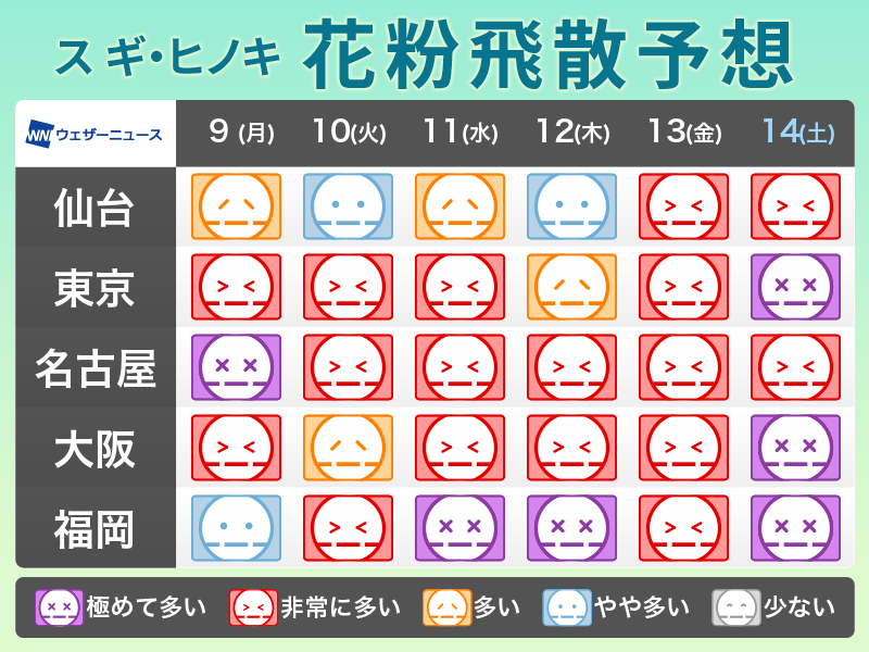 また、次の週末は暖かくなるため、広範囲で花粉の量が多くなりそうです。花粉症の方は、少しの外出でもマスクやメガネを着用するなど、万全な対策を心がけてください。