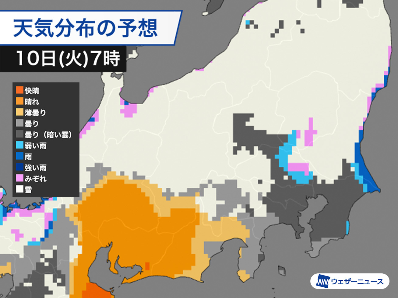 関東北部では未明から明朝にかけて雪のエリアが平野部にも広がり、栃木県から茨城県を中心に雪の朝になるとみています。
