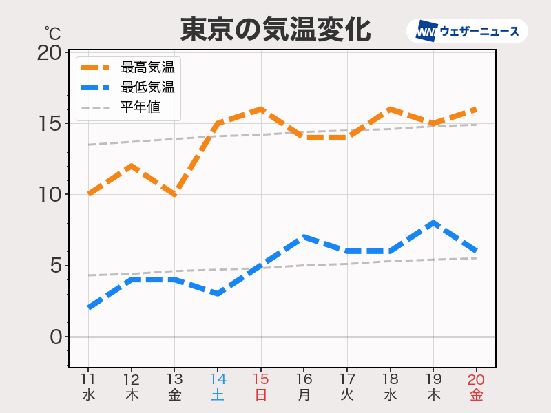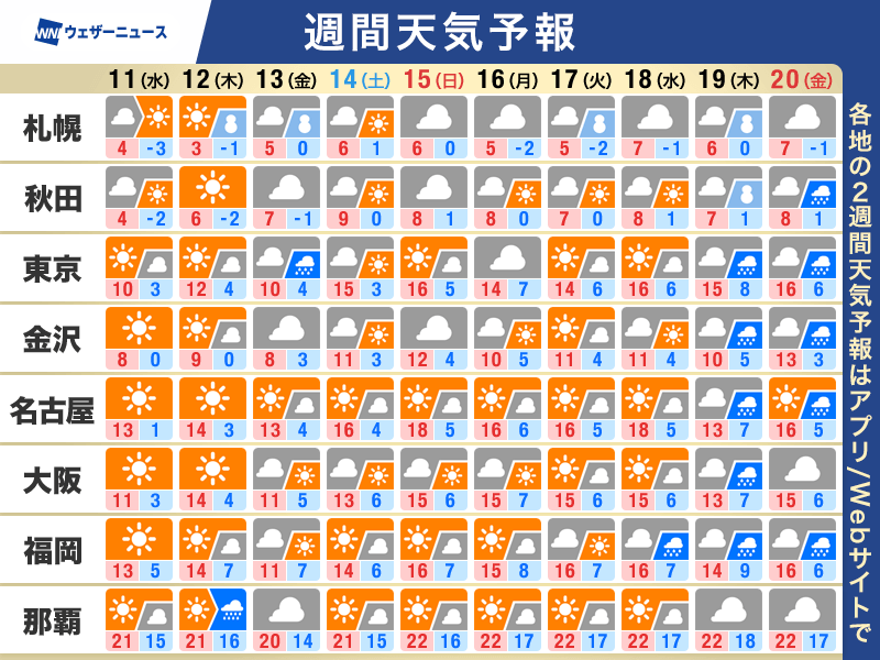 週末からは次第に気温が上がる見通しです。14日(土)や15日(日)は西・東日本では最高気温が15℃前後のところが多く、西日本は20℃近くまで上がる所もありそうです。