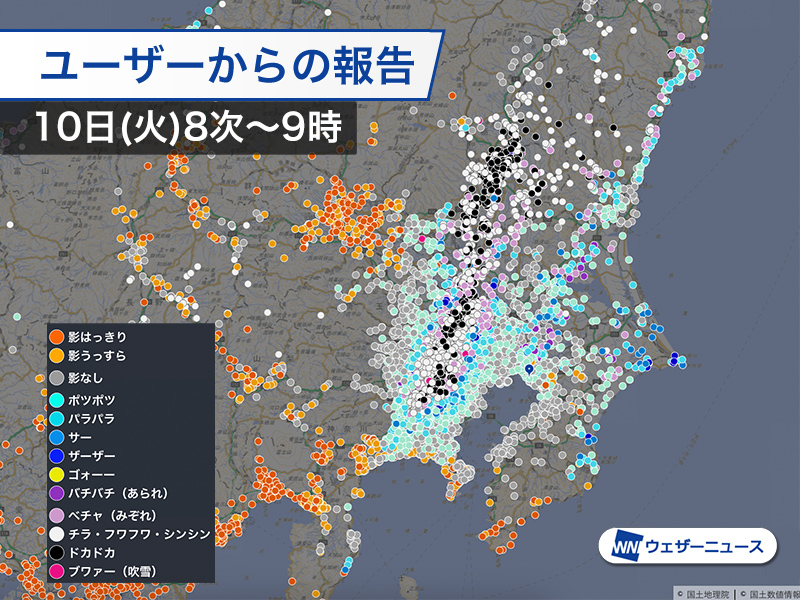 関東南部では昼過ぎまで雨や雪が降りやすい状態が続き、東京23区内でも一時的に雨が雪に変化する可能性があります。局地的に道路にシッカリと雪が積もる可能性があるので、車の運転は冬タイヤを装着していつも以上に慎重に運転してください。交通機関への影響にも要注意です。