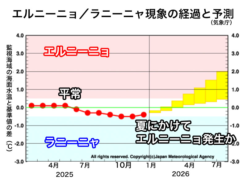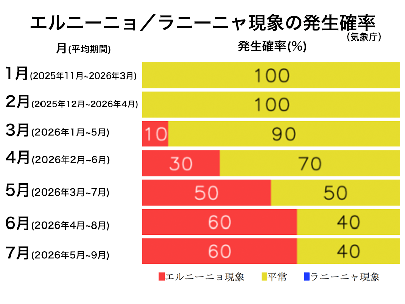 現時点では春の間にエルニーニョ現象が発生する可能性と平常の状態が続く可能性が同程度(50%)となり、夏には平常の状態が続く可能性もあります(40%)が、エルニーニョ現象が発生する可能性の方がより高くなる予想(60%)です。