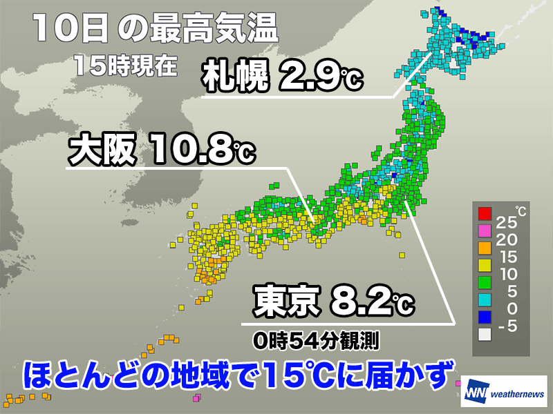 最高気温は札幌で2.9℃、東京で8.2℃、大阪で10.8℃、鹿児島で15.5℃でした。東京の8.2℃は0時54分に観測された気温で、昼間は気温が低下。11時5分には最低気温となる2℃を観測しています。