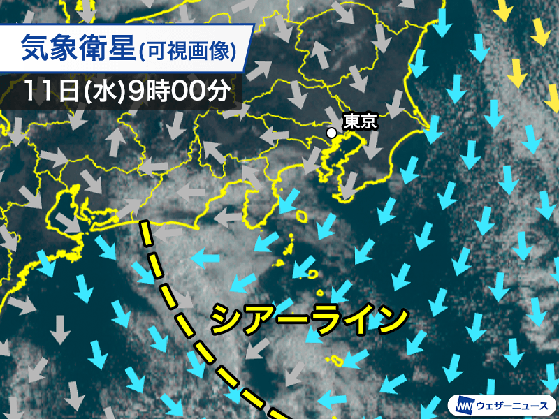 シアーラインは午後になると北東へゆっくりと移動し、関東南部の各地に雲が拡大していく見込みです。