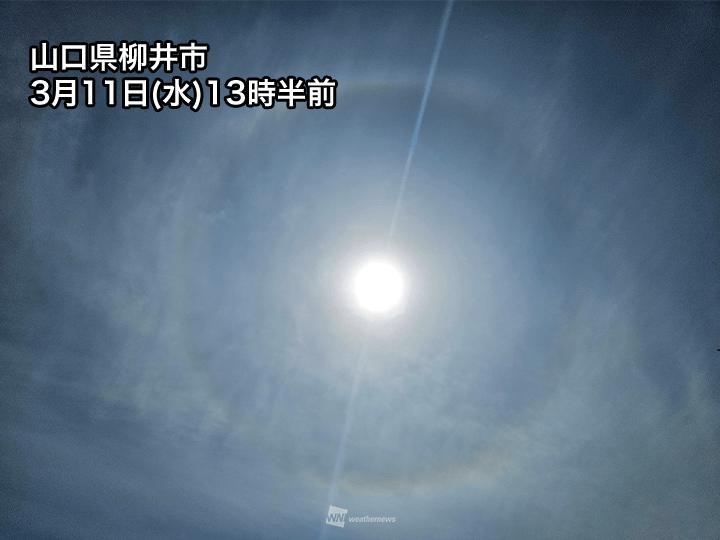 中国地方は高気圧に覆われて、朝から穏やかに晴れています。昼頃から上空の高い所に薄い雲が広がって、太陽の周囲に光のリングが現れました。「ハロ」と呼ばれる現象です。