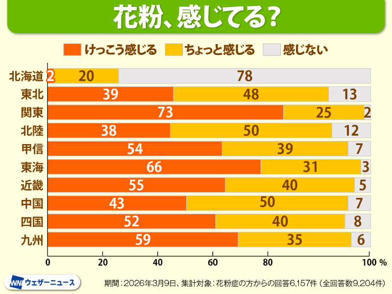 エリア別に見ても、近畿~東北の広範囲で花粉を感じている方が9割前後、関東や東海では「けっこう感じる」の割合も7割前後に上るなど、まだまだ花粉症の方にとってはつらい季節が続いていることがわかります。