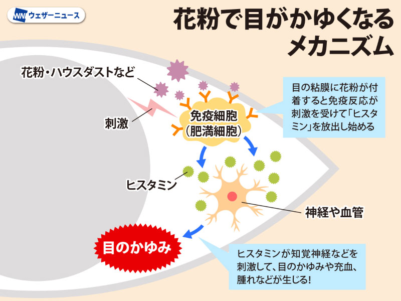 「目の粘膜に花粉が付着すると、花粉症の人は花粉を異物と認識し、免疫反応が働きます。肥満細胞(マスト細胞)などの免疫に関わる細胞が刺激を受けて、ヒスタミンを放出します。すると、ヒスタミンが目の神経などを刺激して、かゆみや充血、腫れが生じてしまうのです。