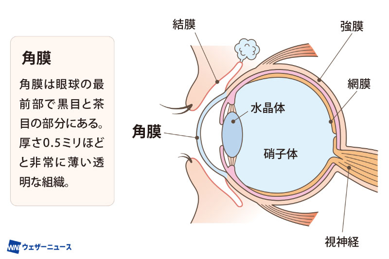 角膜は眼球の最前部で黒目と茶目の部分にあり、厚さ0.5ミリほどと非常に薄い透明な組織です。もし角膜の表面が傷ついてはがれる「角膜びらん」が起こると、激しい痛みや異物感を生じ、視力の低下に至ることもあります。