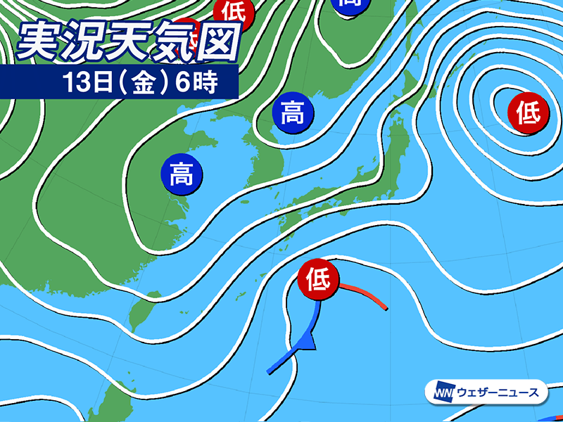 今日13日(金)は本州南岸の低気圧が急速に発達しながら東に進みます。伊豆諸島南部では暴風雨に厳重な警戒が必要です。