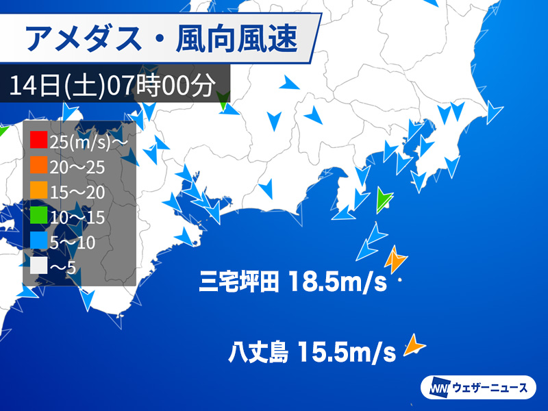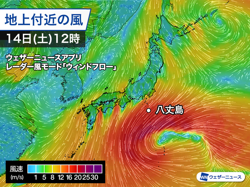 低気圧の北側に位置する伊豆諸島では等圧線の間隔が狭く、風が吹き荒れています。14日(土)未明には八丈島で最大瞬間風速30.6m/sを観測しました。
