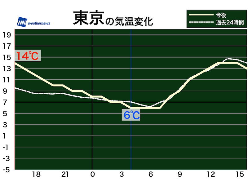 今日と同じような気温変化となります。朝は寒くても、昼間は日差しが暖かく感じられそうです。