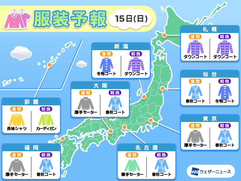 今日と明日の気温変化を比較して、気温に適した服装をご提案します。ウェザーニュースの服装予報もご活用ください。