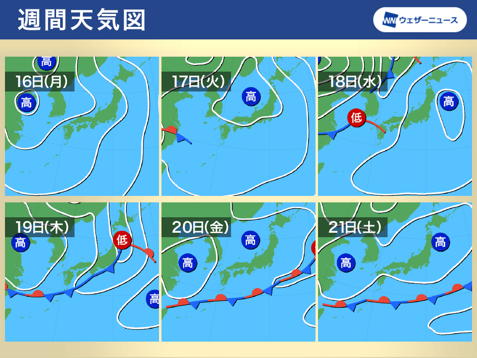 週明けの16日(月)から17日(火)にかけては、移動性高気圧に覆われて全国的に穏やかな晴天となる見込みです。
