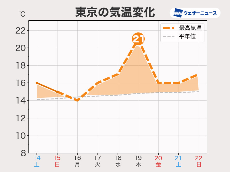 来週は平年並みか平年を上回る気温の日が続きます。東京でも日中は20℃近くに達する日がある予想です。北海道も10℃近くまで気温が上がる日が増えます。